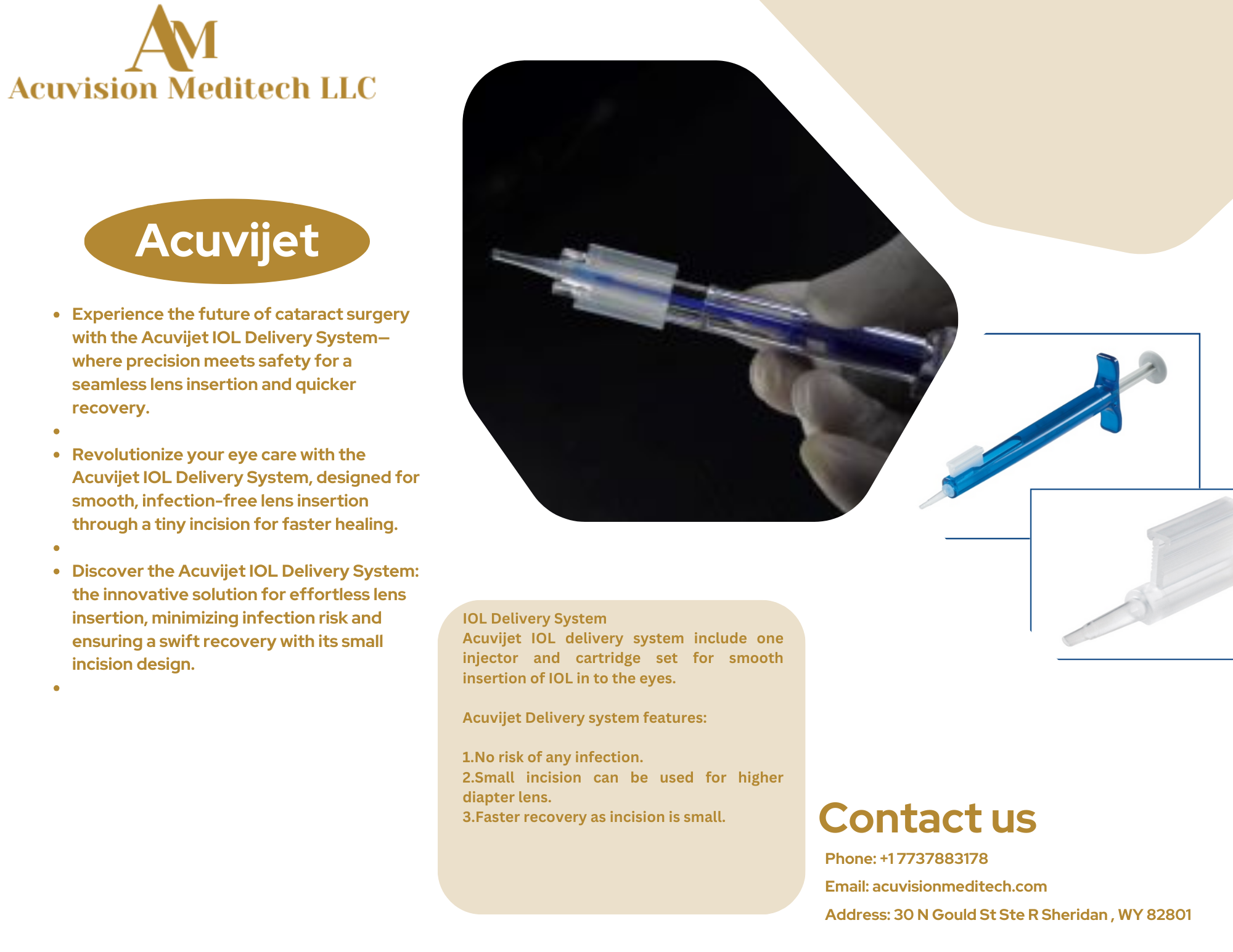 Acuvijet IOL delivery system include one injector and cartridge set for smooth insertion of IOL in to the eyes.